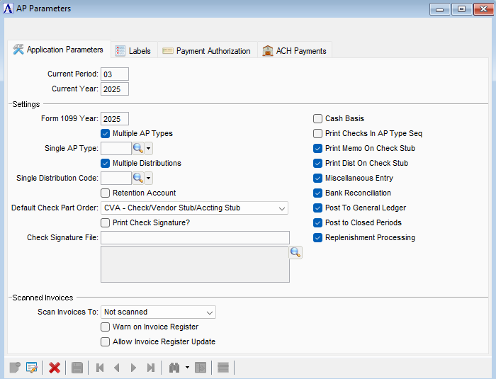 The application parameters must be defined as part of the module installation, and generally these are not modified later. The parameters are used throughout the Accounts Payable tasks to control how the module functions. The AP Parameters form has four tabs - Application Parameters, Labels, Payment Authorization and ACH Payments.