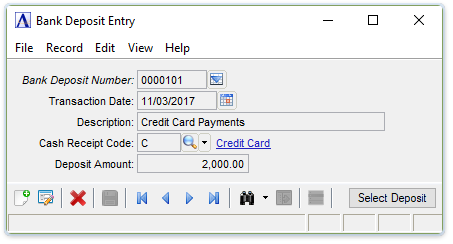 After calling up an existing deposit or entering and saving a new deposit, click the Select Deposit button to dismiss the Bank Deposit Entry form and carry the selected deposit number into the Cash Receipts form.