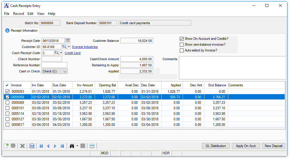 Enter the on-account invoice number (yymmdd) in the Invoice field and apply a negative amount to the on-account invoice in the same amount as applied to the invoices that were paid.