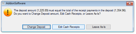 When leaving the Cash Receipts Entry task, the amount entered or accumulated in the Bank Deposit Entry form is compared with the total of receipts associated with the deposit. A warning displays if the amounts are not equal.