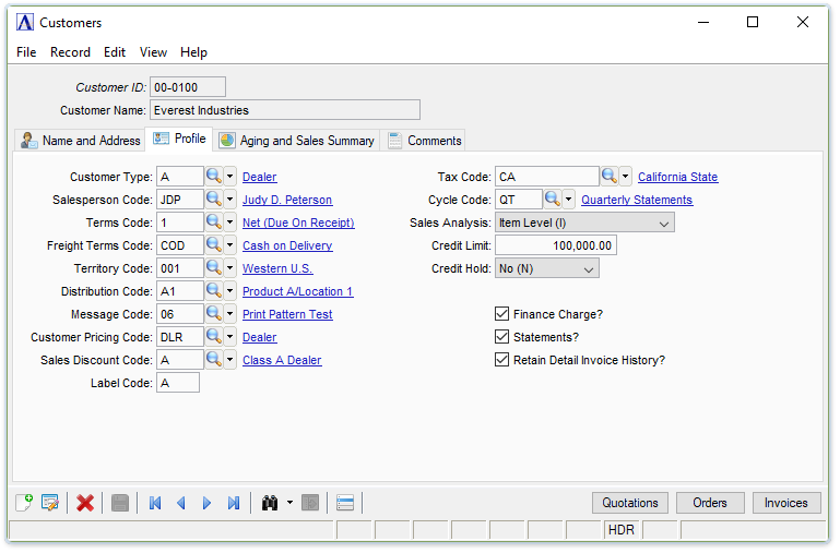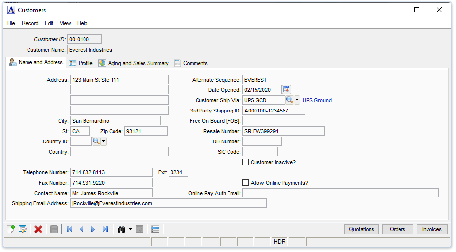 The Customers maintenance task allows for the entry of new customers, maintenance of existing customers. There are four tabs on this form - Name and Address, Profile, Aging and Sales Summary, and Comments. There is an Additional options dropdown list of additional functions available from this form as well.