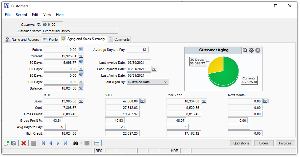 The Aging and Sales Summary tab provides online inquiry into a customer's accounts receivable balance, summarized aging, average days to pay and summarized sales and gross profit information. All fields are display only.