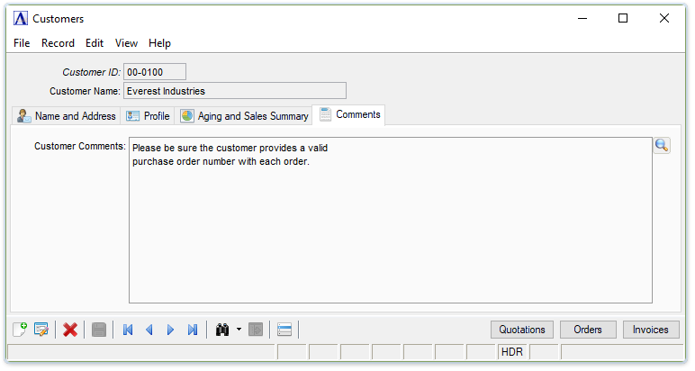 Enter free-form comments about the customer. These comments are useful in tracking special purchasing or accounting information for a customer.