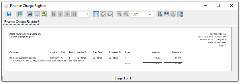 The Finance Charge Register task prints a report of all calculated finance charges prior to making postings to the customers' accounts. Included is all finance charges automatically created by the Finance Charge Creation task and manually entered through the Finance Charge Entry task. Finance charges may be optionally posted to the general ledger.