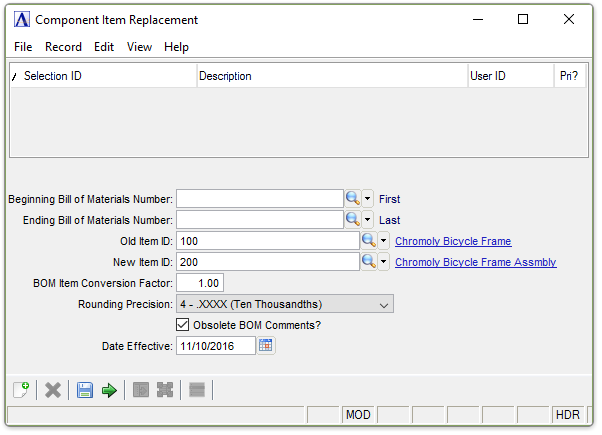 Searches for components in a bill, or bills, that you want to replace with another component. Entering an effective date makes the “old item” obsolete as of the effective date and creates a new line item for the new item. All quantities of the component will remain the same for the new item with the exception of the effective date.