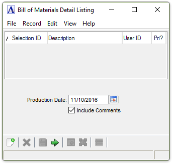 The production date entered is used in conjunction with the effective and obsolete dates entered for materials, operations, and subcontracts, to determine which items are to be included on the report.