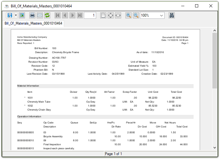 This option prints all information for a selected bill number. An asterisk (*) next to the component item number on the printed form indicates a bill number.
