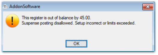 This register is out of balance. Suspense posting disallowed. Setup incorrect or limits exceeded.