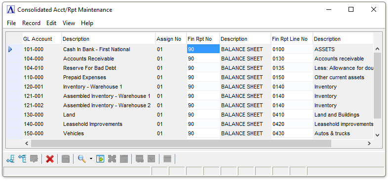 Similar to Account/Report Maintenance, this task allows for rapid assignment of general ledger accounts to consolidated financial reports. Each account can be assigned to up to ten different consolidated reports. The consolidated reports must be defined within company 99.