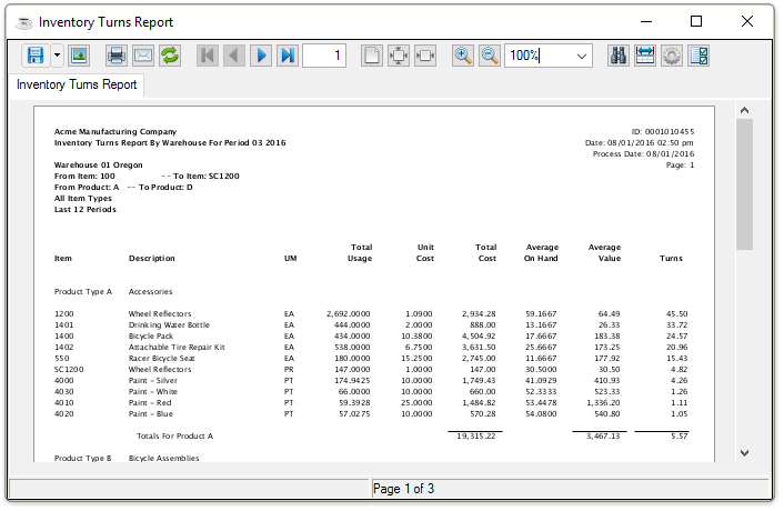 Use this task to create a report showing the total usage, total cost, average on hand, average value, and turns of inventory for the last 12 periods. The report may be created for a single warehouse and list items within a specific warehouse or product category.