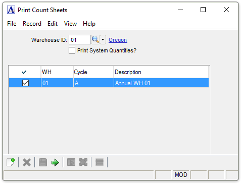 Count sheets can only be printed after inventory items are selected for physical count processing through the Select Cycles for Freeze task. Count sheets aid in the actual counting of inventory and show all items selected for processing.