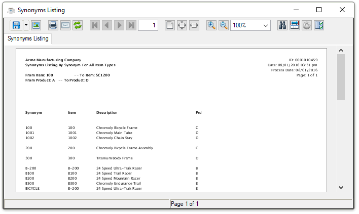 Use this task to create a listing of all synonyms referencing inventory items. A listing may be created to show the synonyms and the items referenced by the synonym or to show items and the synonyms used for the item.