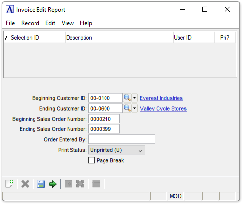 Select Invoice Edit Report from the Sales Order Processing main menu.