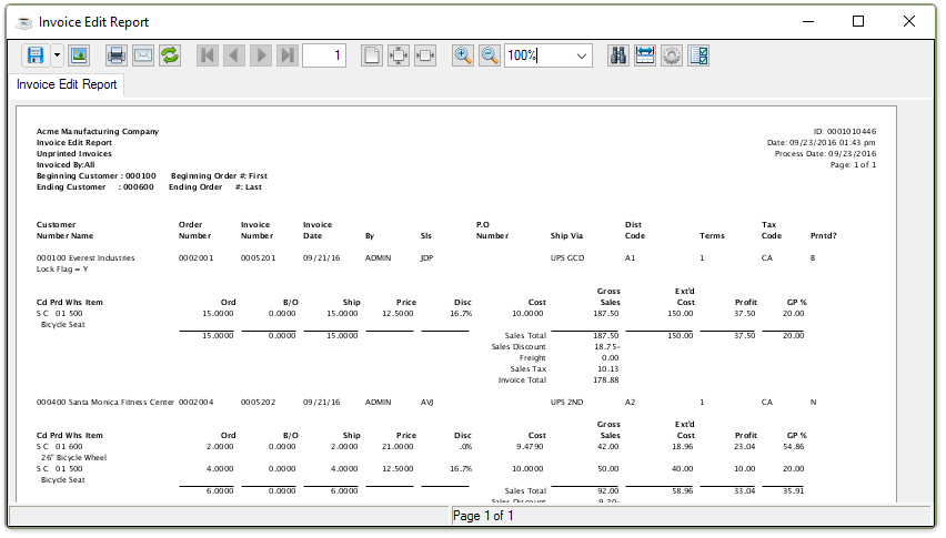 This report may be used to audit customer invoices before printing. The report lists all invoices on file for a range of customer or order numbers, with an “invoiced by” identification code. Unprinted invoices, printed invoices, or both may be selected. The printed report shows the requested invoices by customer, with a recap by product code and line item code.