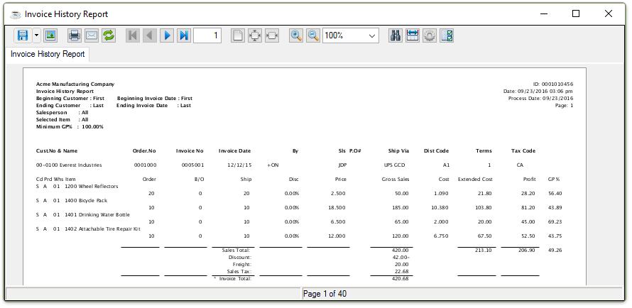 Use this report to review detailed historical invoice information. All or designated historical invoices, and select by customer number range, invoice date range, salesperson code, item number, and minimum gross profit percentage may be viewed.