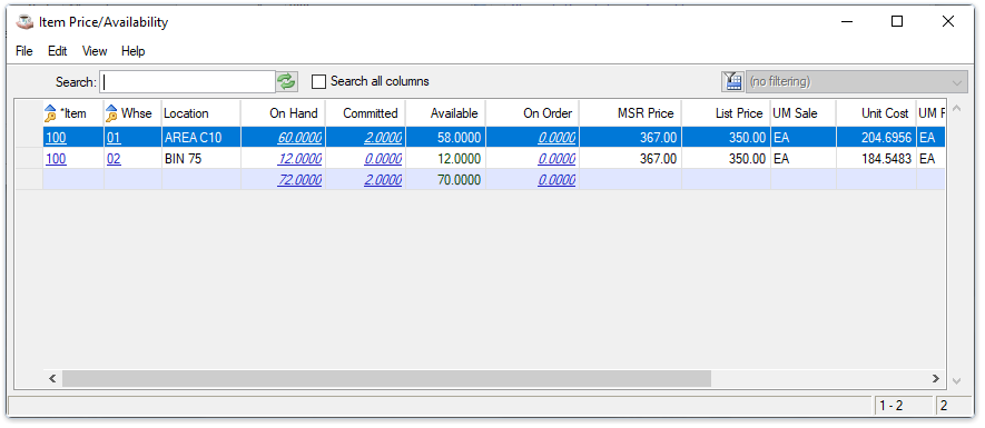The Item/Price Availability form includes convenient hyperlinks to the Warehouses, On-Hand, Committed, On-Order, and Alt/Sup Item.