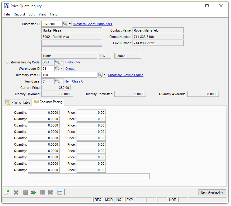 Use this task for a quick method of determining price quotations for customers. Pricing tables are based on information entered in the Pricing Table Maintenance task. If contract pricing for the item is available to the customer, that can be displayed as well. Price Quote Inquiry features appear in two tabs; Pricing Table and Contract Pricing.