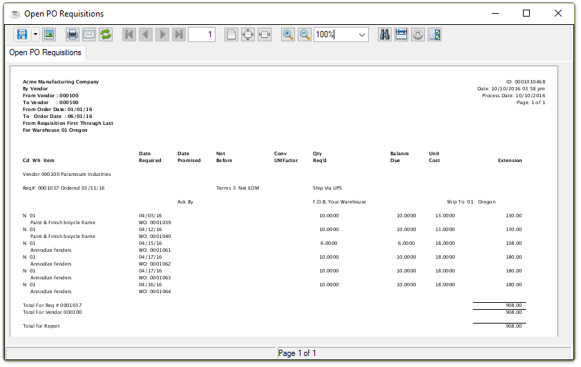 Use this task to create a report showing all or selected open purchase requisitions on file. The report can be run at any time for all or selected vendors, and for a single warehouse or all warehouses.