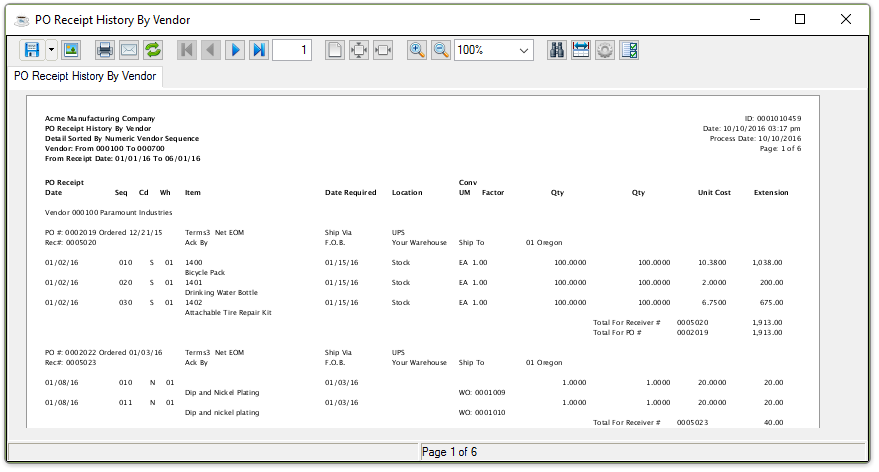 Sample PO Receipt History by Vendor Report