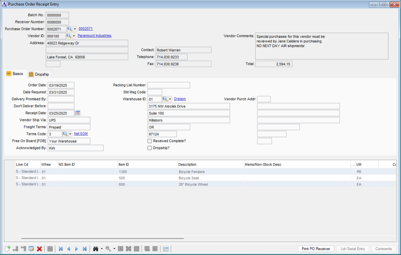 Use this task to enter purchase order receipts into the module. Purchase order receipts are made against orders previously entered with the Purchase Order Entry task, but new detail lines can be added to a purchase order during receipt entry. The Purchase Order Receipt Entry task features appear in two tabs; Basics and Dropship. Buttons on the form provide access to [Print PO Receiver], [Serial Entry] items, and for adding [Comments].