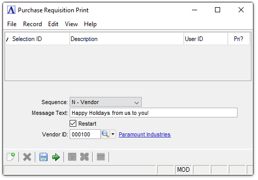 Requisitions may be printed in sequence by warehouse or vendor. The Restart and Vendor ID fields are used to create a list from a specific vendor number instead of the entire vendor list.