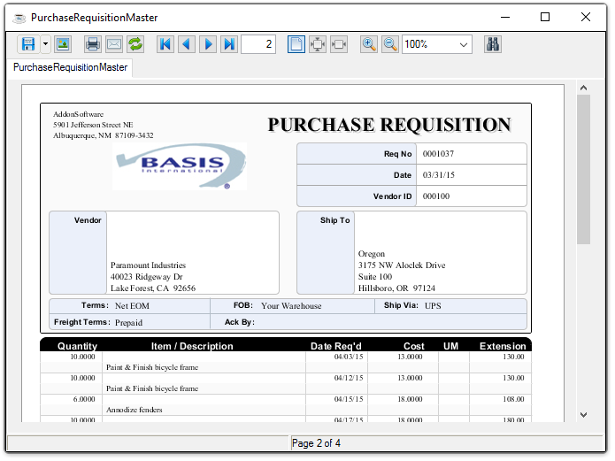 Sample Purchase Requisition Print Preview