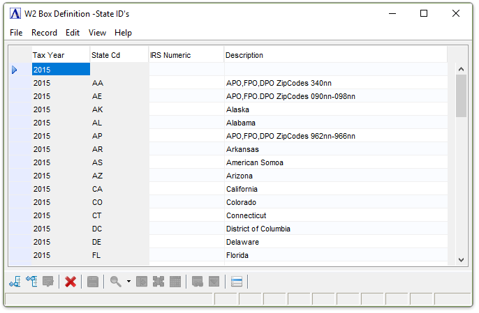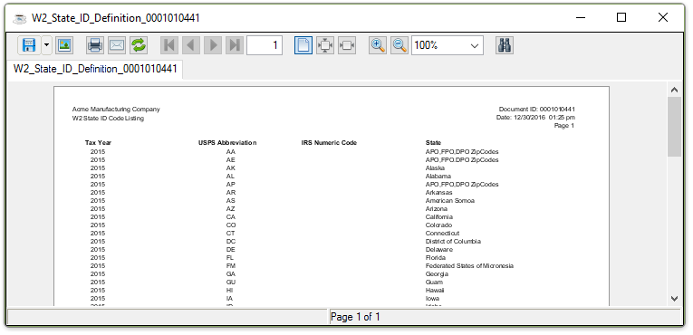 The W-2 Form State ID task is used to set up the valid W-2 State Codes used in the Configuration Process. The State Code and its IRS Numeric Designations are as specified in the Filing Forms Electronically, guidelines published by the Social Security Administration. The Display additional options... button provides access for creating a Code Listing report.