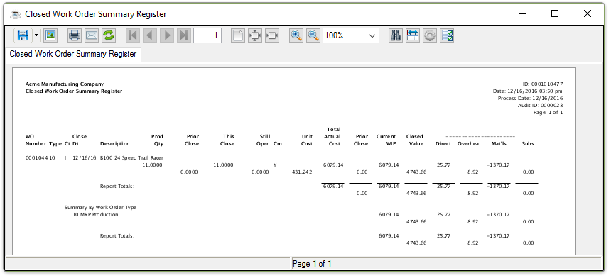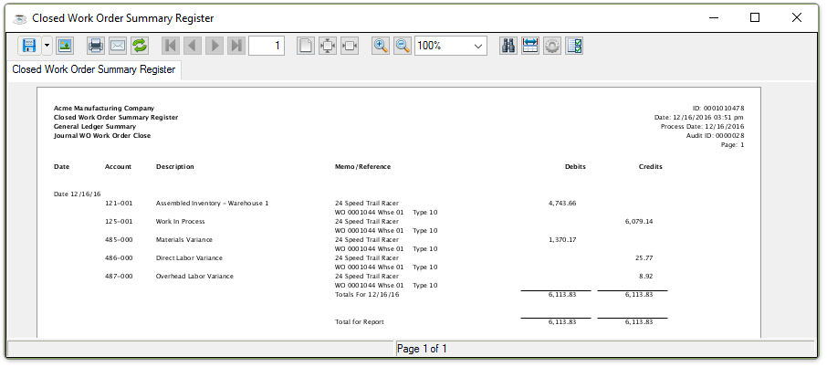 This register creates a summary of the Work Order Close Data Entry information (including both standard and actual costs) and a summary of general ledger postings for the work orders that are being closed.