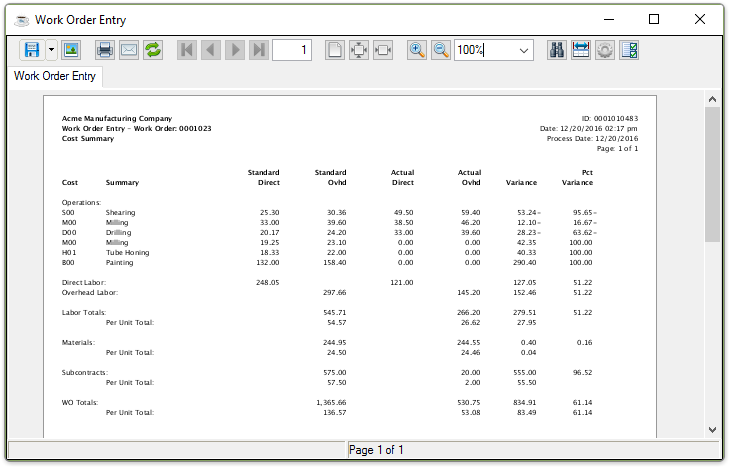 The Cost Summary displays the total standard and actual cost of labor, materials, and subcontracts at standard and actual, the amount of variance between actual and standard, and the percentage of variance between actual and standard. It divides these totals by the scheduled production and shows the resulting standard, actual, variance, and variance percentage figures as “Per/Unit Total.” The Totals portion of the display shows the total accumulated cost in the work order for Labor, Materials, and Subcontracts, and the Number of Labor Hours. These figures are then divided by scheduled production to show the “Per/Unit Total” for these costs and number of hours.
