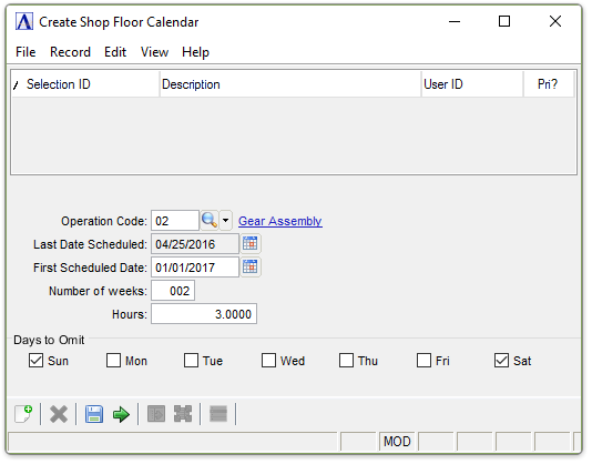 Select Create Shop Floor Calendar from the Inquiry and Maintenance menu.
