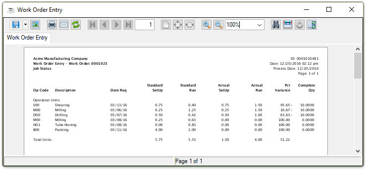 Displays the difference in the percentage of the standard and actual setup costs and run times. Negative variances are shown when actual setup cost is greater than standard setup cost