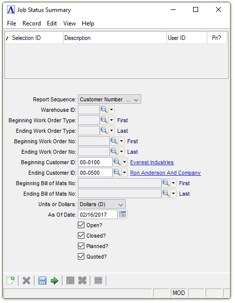 The requested information differs depending on what you entered in the selected Report Sequence field. For Work Order (W), enter the lowest work order number that is to appear on the report. For WO Type (T), enter the lowest work order type code that is to appear on the report. For Customer Number, enter the lowest customer number that is to appear on the report. For Bill Number, enter the lowest item code that is to appear on the report. Numbers sort before letters.