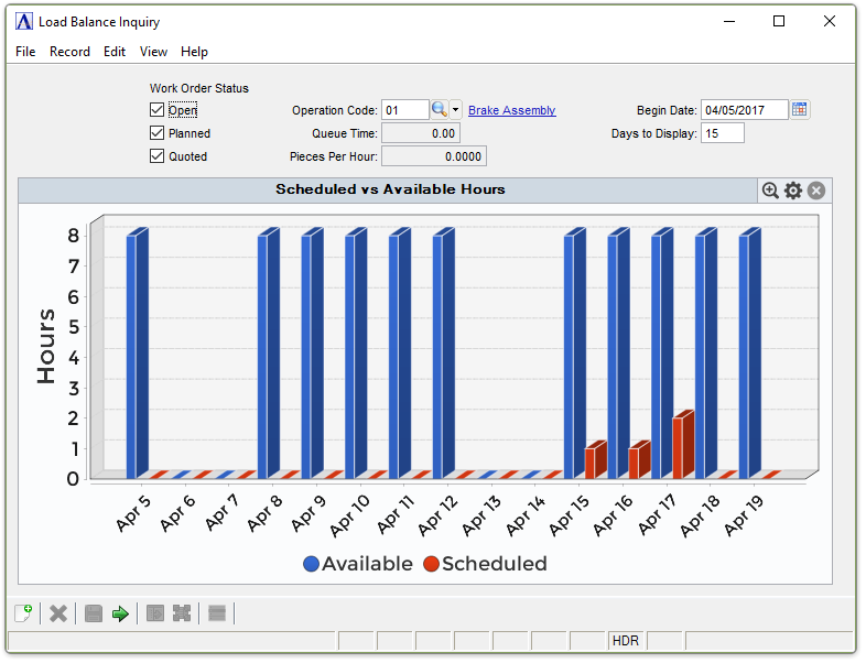 How evenly the workload is distributed between work centers. The Load Balance Inquiry compares available hours to scheduled hours. Inquiry provides a view of the impact that open