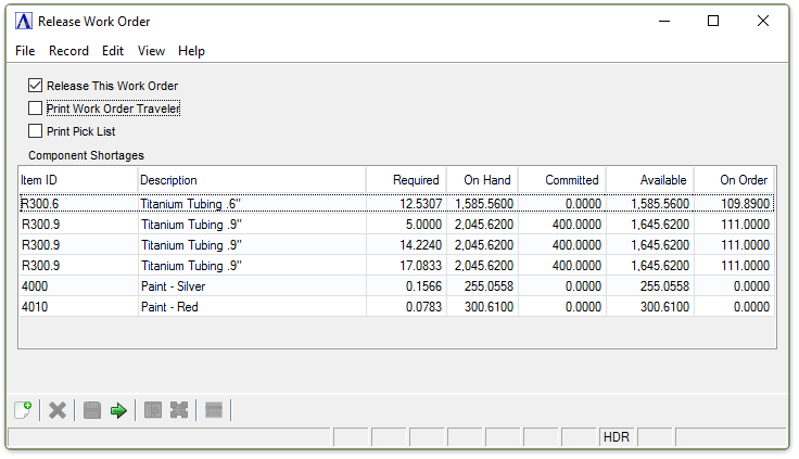 When a work order is released the material necessary for the production of the work order is committed from inventory and will not be available for other production. All components of the work order are displayed and any shortages (Required quantity being greater than Available quantity) are shaded red.