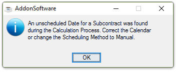An unscheduled Date for a Subcontract was found during the Calculation Process.