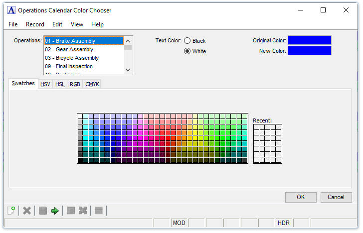 Select Adjust Colors from the Additional Options menu to launch the color chooser form. Colors are stored by user for each operation.