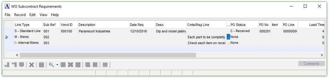 This function is active only if the Purch Order Interface Enabled parameter is ‘checked’ in Work Order Parameters. Subcontracts are not active for recurring work order.