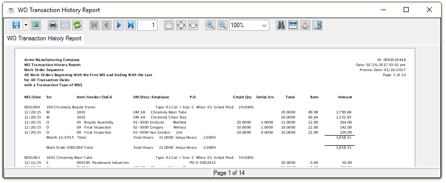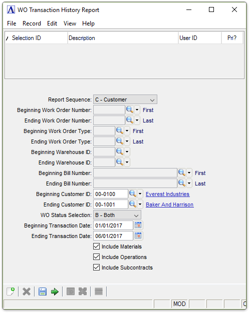 The requested information differs depending on what you entered in the Selected Report Sequence field .For W – Work Order, enter the lowest work order number that is to appear on the report. For T – WO Type, enter the lowest work order type code that is to appear on the report. For C – Customer, enter the lowest customer number that is to appear on the report. For B – Bill Number , enter the lowest item code that is to appear on the report. Numbers sort before letters.