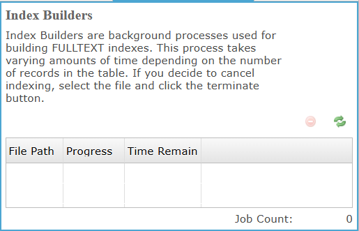 Index Builders pane displays background FULLTEXT index build jobs, showing file path, progress, and remaining time, allowing administrators to monitor and terminate indexing processes.