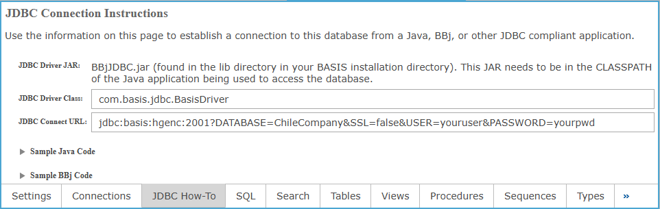 The sample codes below will change based on the database selected. In these examples the administrator can copy and paste codes in a java application or a BBj Application to access the Chile Company Database.