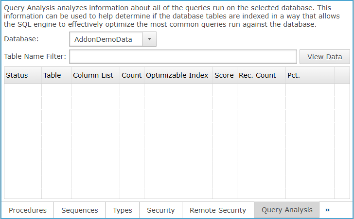 Query Analysis analyzes information about all of the queries run on the selected database. This information can be used to help determine if the database tables are indexed in a way that allows the SQL engine to effectively optimize the most common queries run against the database.