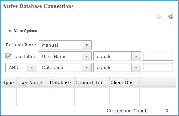 The More Options section controls how connection data is refreshed and filtered, allowing manual refresh selection and conditional filtering by user name and database using logical operators to narrow results displayed in the connections grid.
