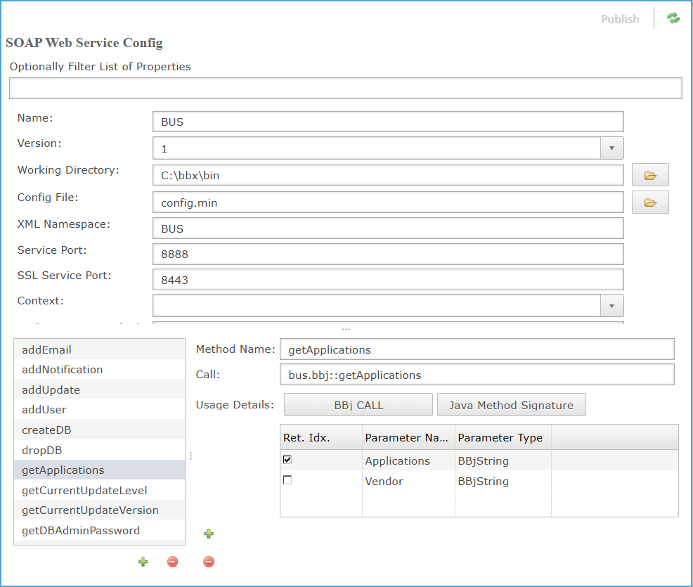 To access SOAP Web Services Configuration, expand the Web folder and double-click SOAP Web Services Configuration in the BBj EM Navigator. The SOAP Web Services tab will open to the right.