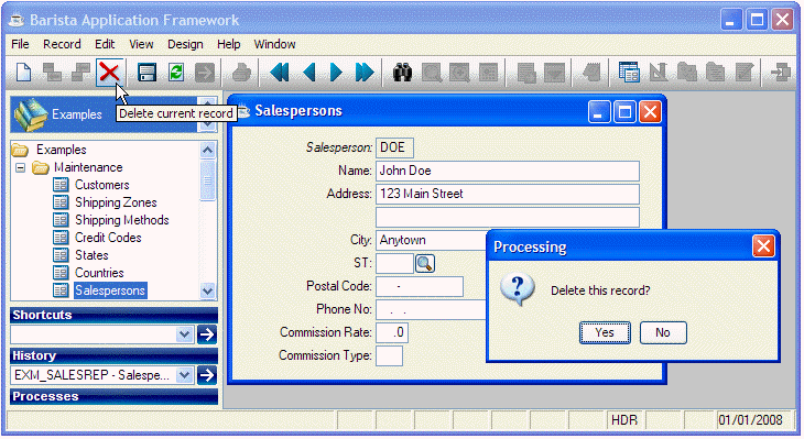 To delete the current record, select Record > Delete from the menu, press Ctrl+Delete, or press the